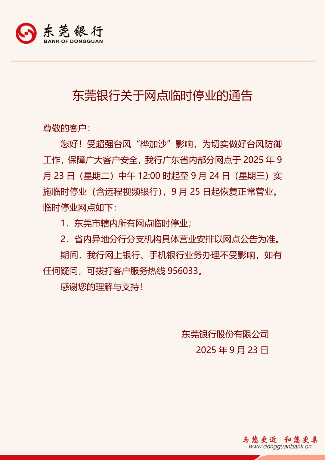 东莞银行关于网点临时停业的通告
